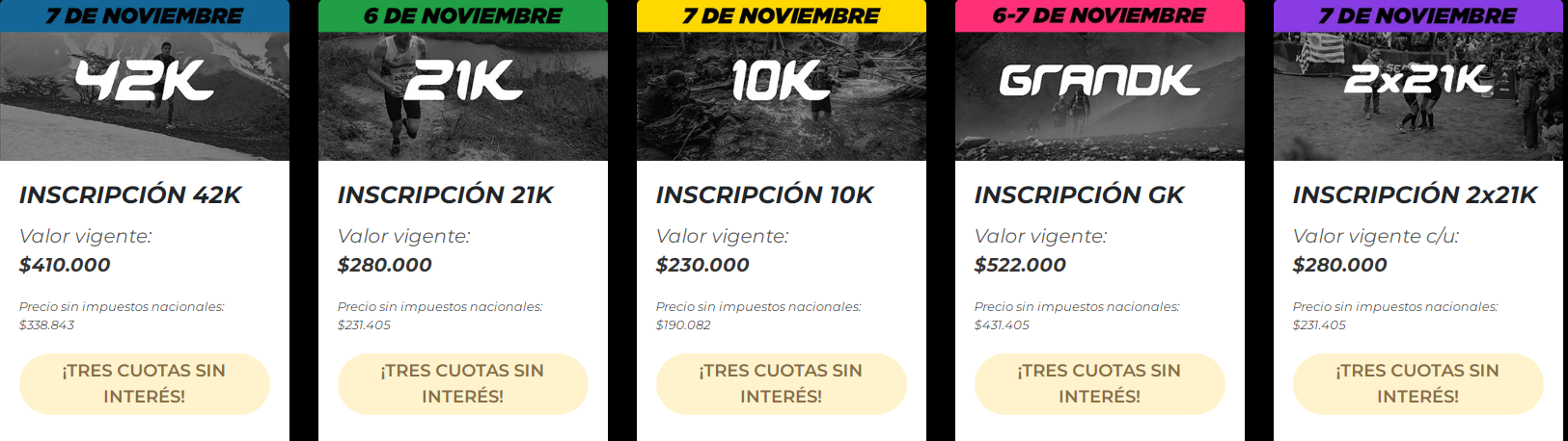 • 42K (Maratón de montaña) • 21K (Medio Maratón) • 10K (Carrera de iniciación) • GrandK (42K + 21K) • 2x21K (Relevos en equipo)